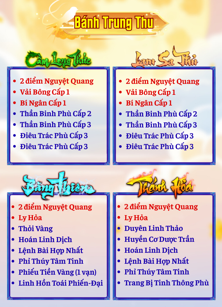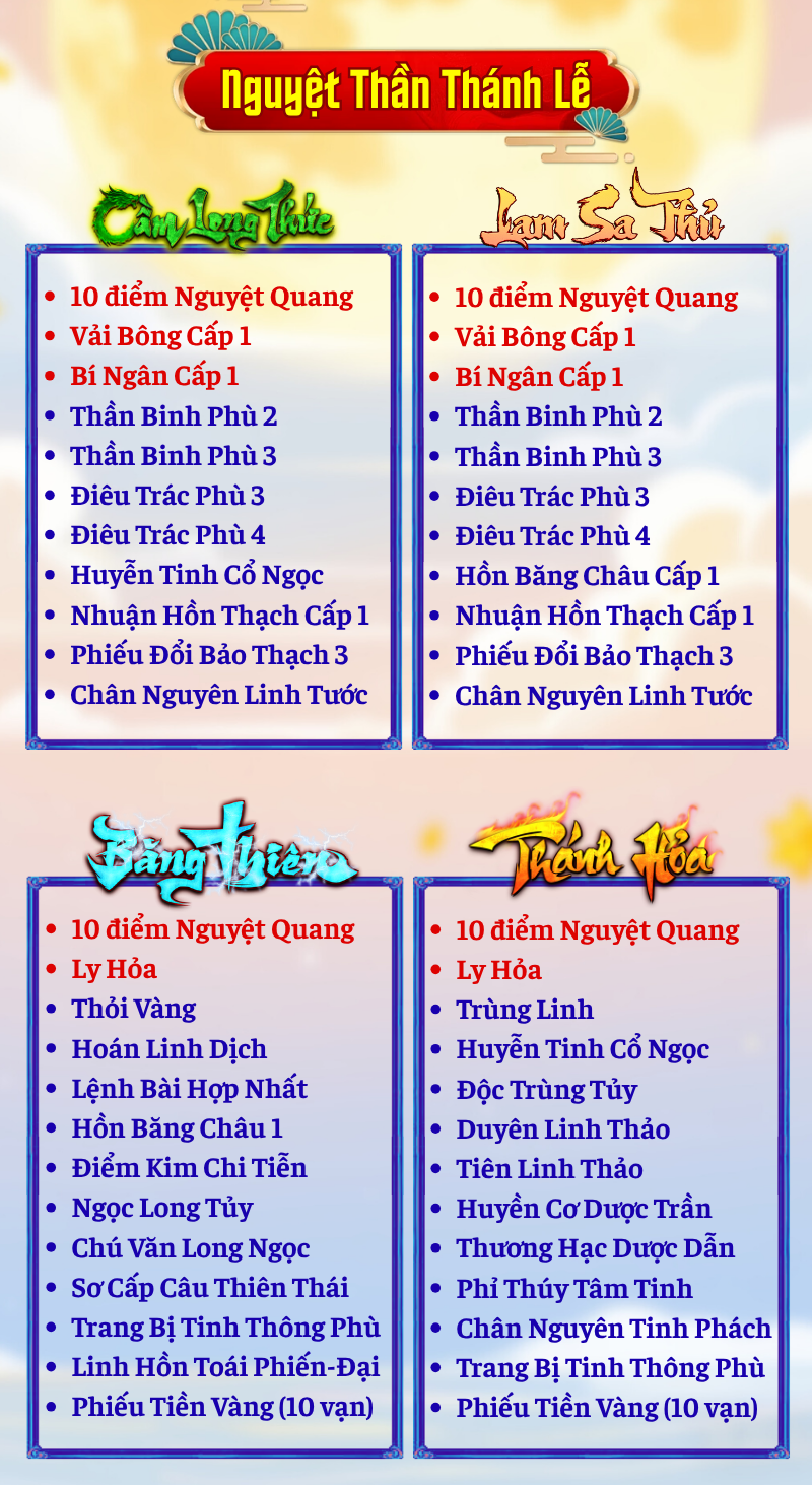 - ➢ Tất cả quà tặng trong sự kiện đều là vật phẩm không cố định (trừ Chân Nguyên)